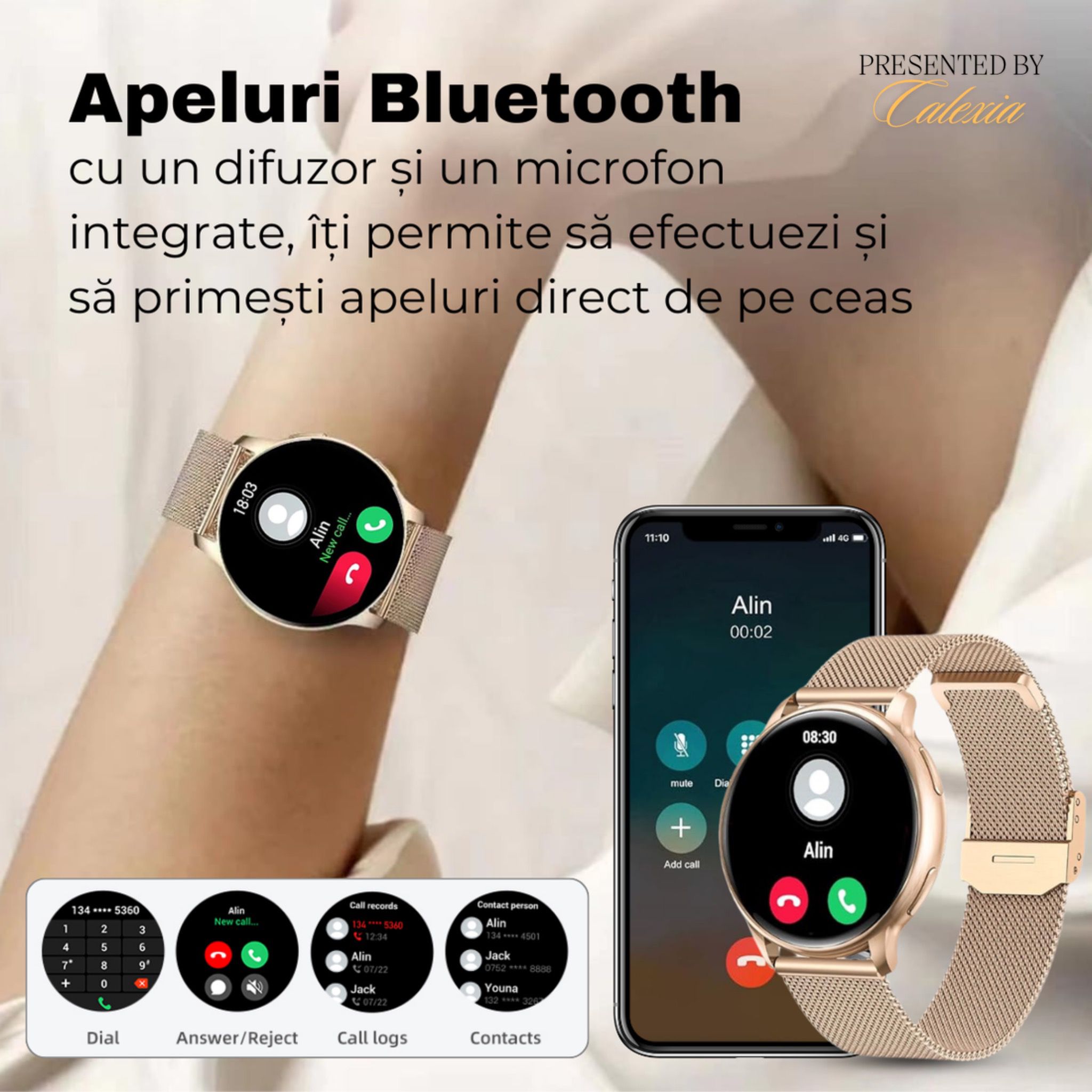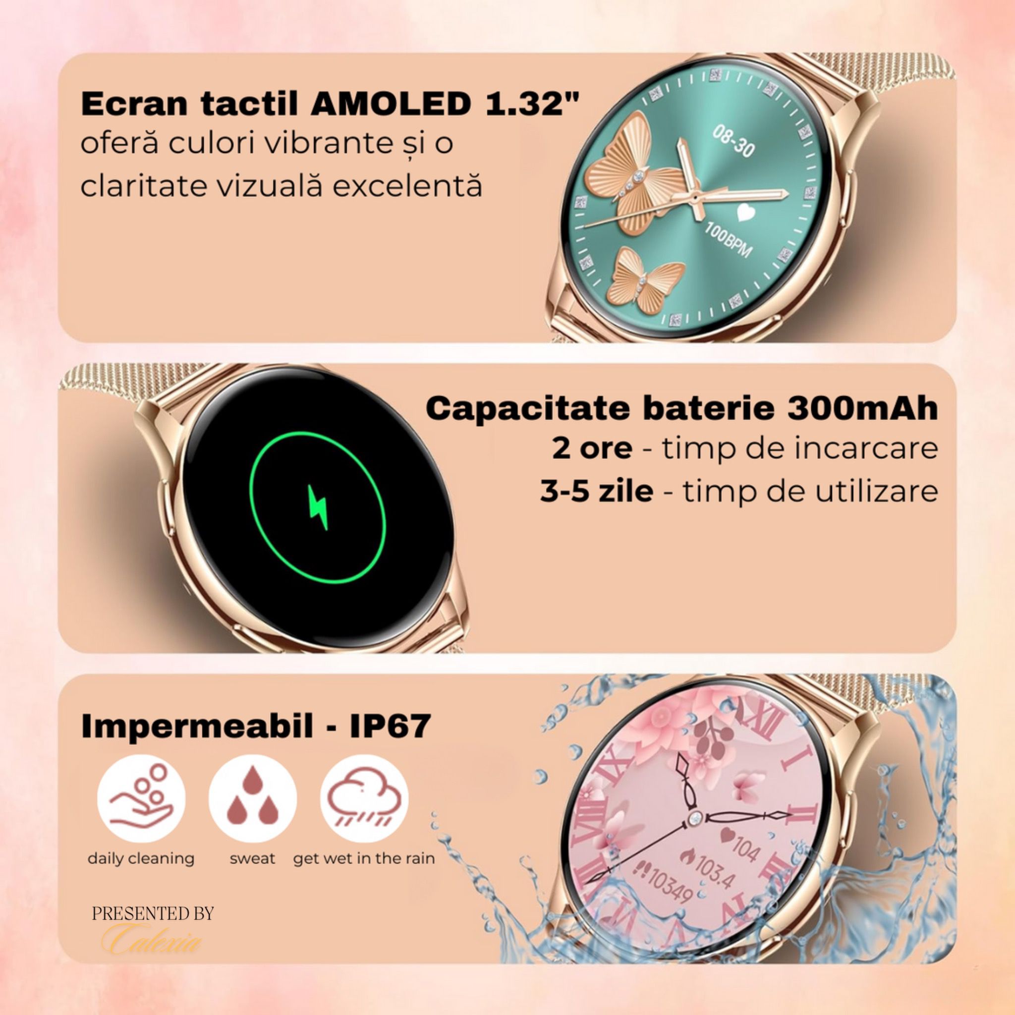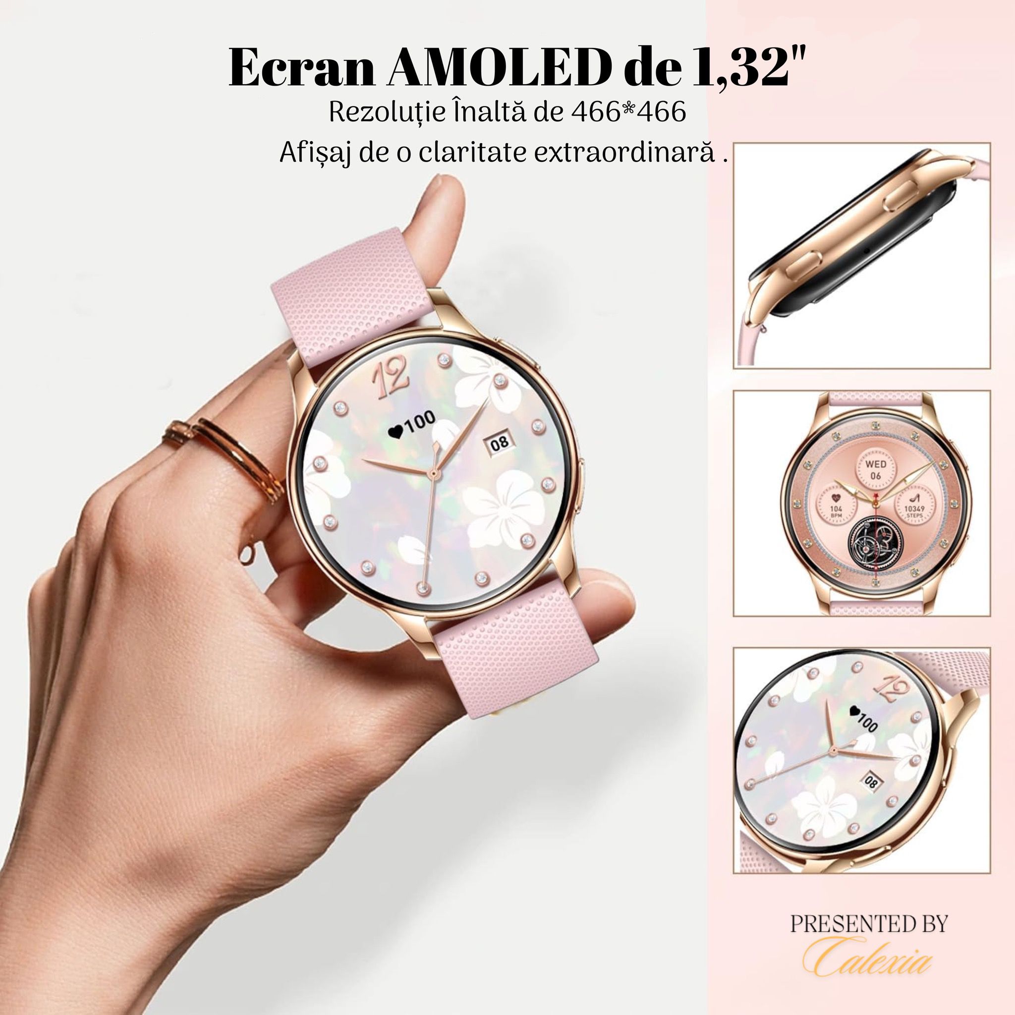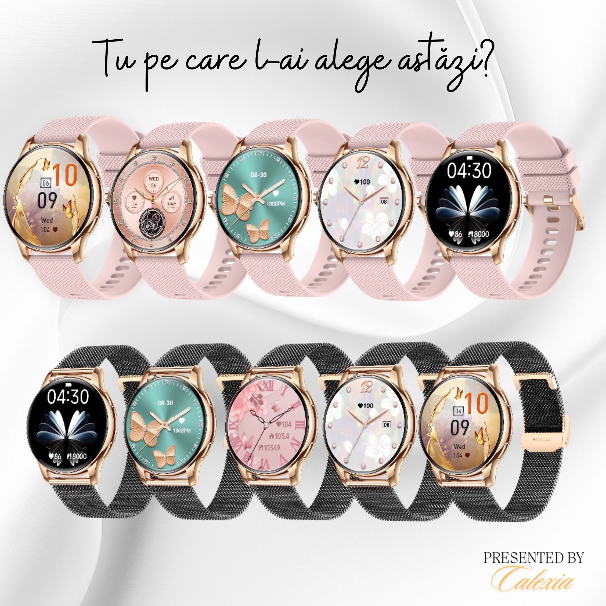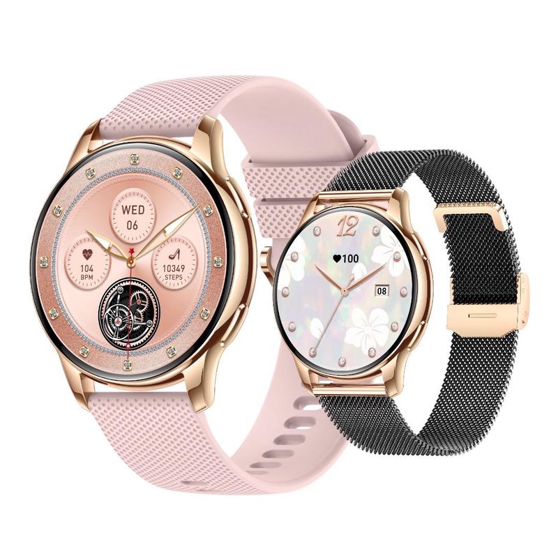 Smartwatch-ul Y11, compatibil universal cu Android si iOS, aduce un design elegant si versatil. Dotat cu un ecran AMOLED vibrant de 1.32 inch, o baterie puternica de 300mAh si functii avansate de sanatate si conectivitate, acest ceas vine in pachet cu doua bratari interschimbabile: una din silicon roz, pentru un aspect casual, si una metalica neagra, perfecta pentru ocazii elegante. Cadranul auriu completeaza un look sofisticat, fiind ideal pentru utilizatori care cauta combinatia perfecta intre stil si tehnologie.