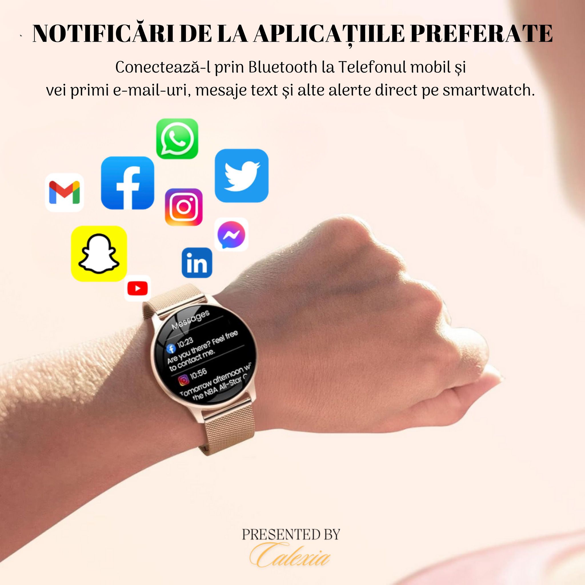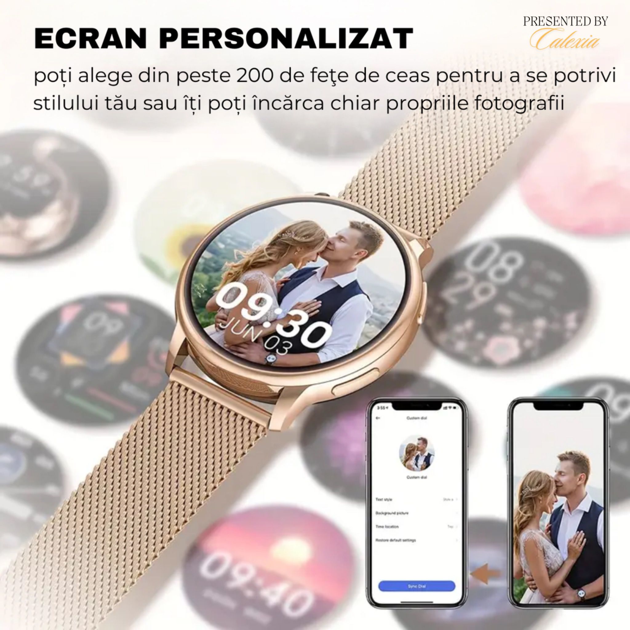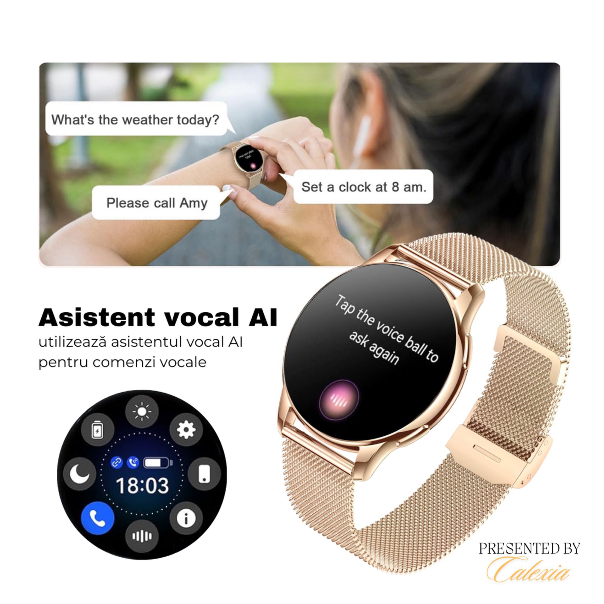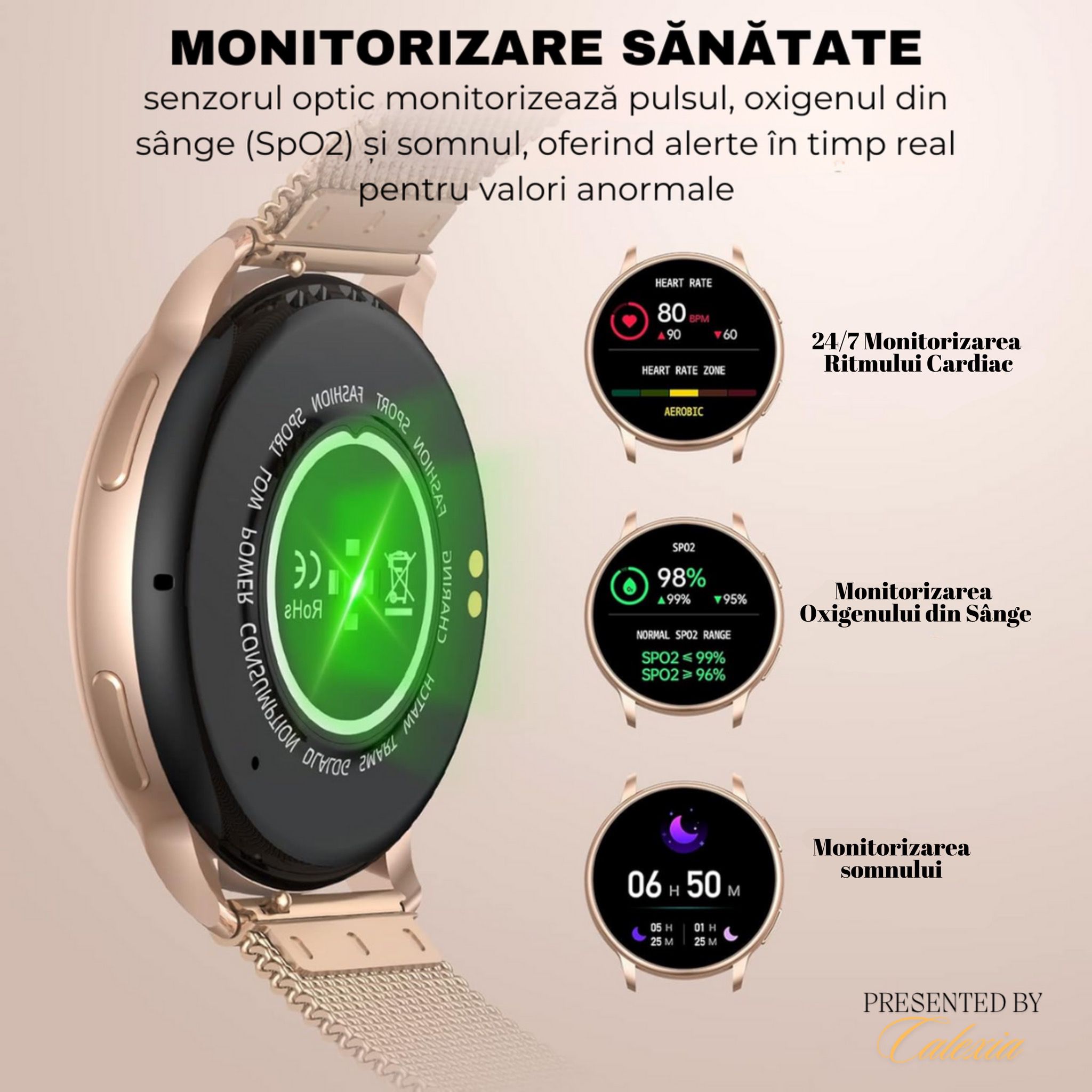Smartwatch-ul Y11, compatibil universal cu Android si iOS, aduce un design elegant si versatil. Dotat cu un ecran AMOLED vibrant de 1.32 inch, o baterie puternica de 300mAh si functii avansate de sanatate si conectivitate, acest ceas vine in pachet cu doua bratari interschimbabile: una din silicon roz, pentru un aspect casual, si una metalica neagra, perfecta pentru ocazii elegante. Cadranul auriu completeaza un look sofisticat, fiind ideal pentru utilizatori care cauta combinatia perfecta intre stil si tehnologie.