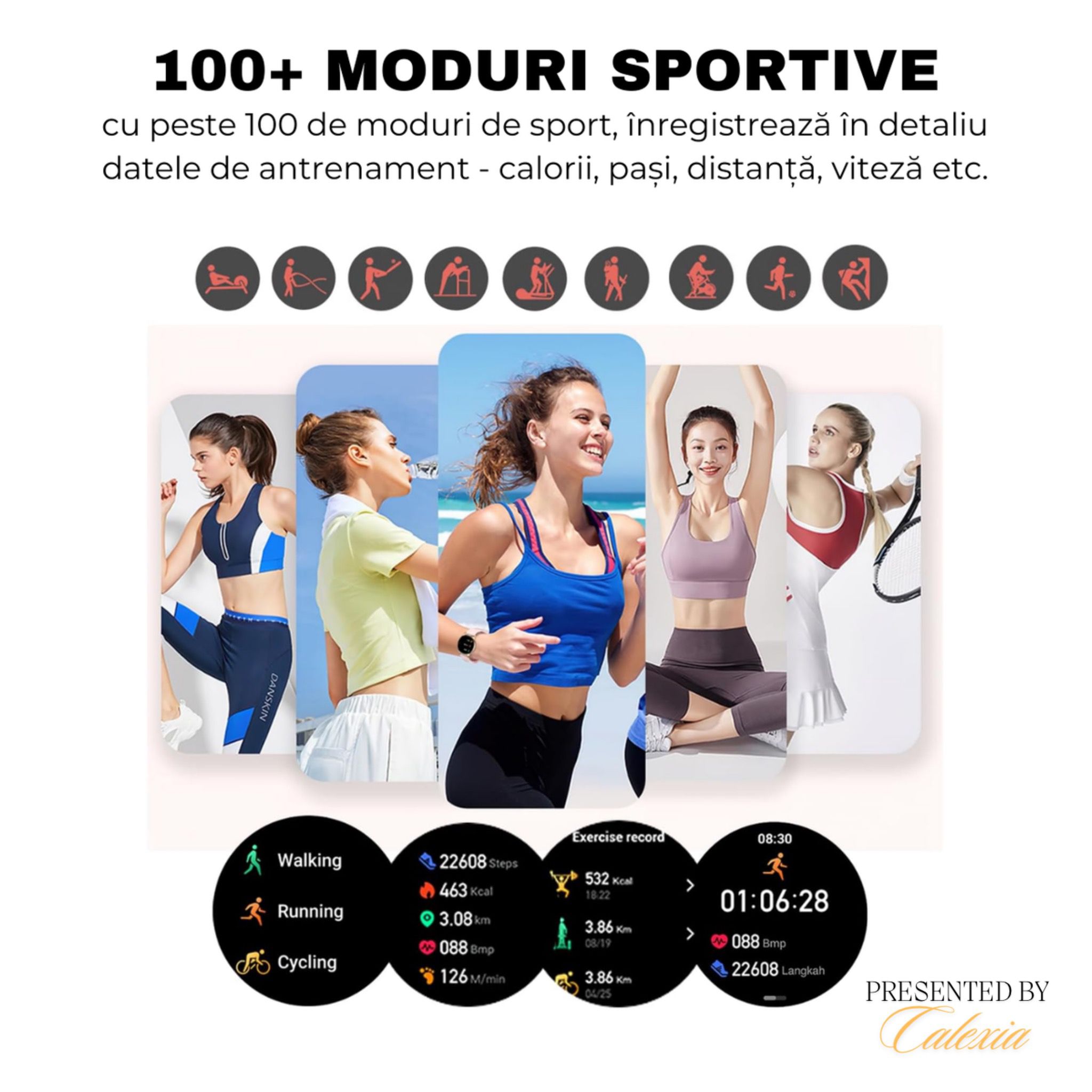 Include 8 moduri standard (alergare, ciclism, yoga etc.) si suport pentru peste 110 sporturi prin aplicatie.