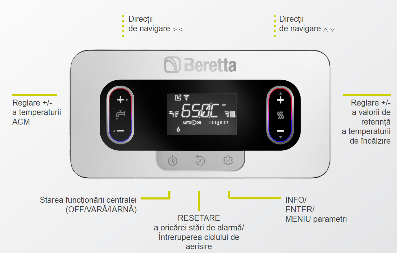 Ecranul interfeței de 2,8'' comunica cu utilizatorul si cu instalatorul prin intermediul pictogramelor, permitand o intelegere imediata a functiei afisate.