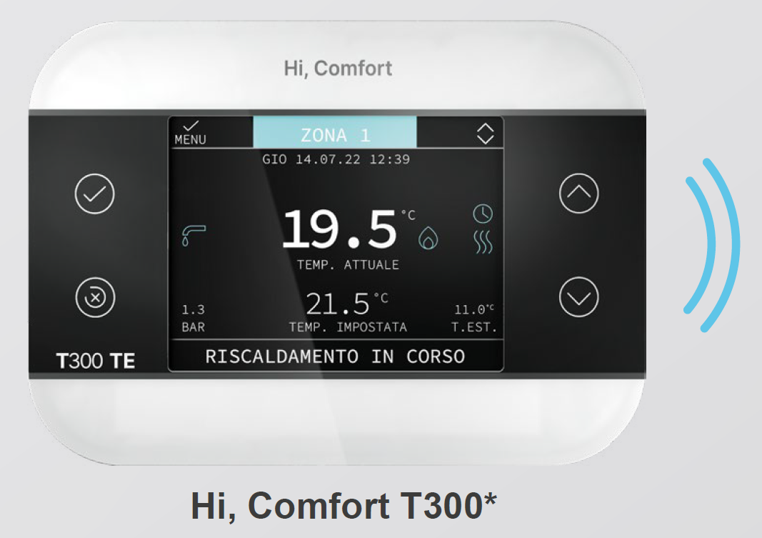 MYNUTE EVO X este compatibil si cu Hi Comfort T300, noul controler de camera cu design elegant si modern, ce integreaza functii avansate, inclusiv gestionarea de la distanta a unui sistem hibrid.