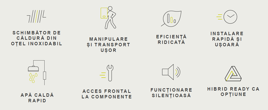 - Schimbator de caldura nou din otel inoxidabil, cu control adaptiv al combustiei (ACC).