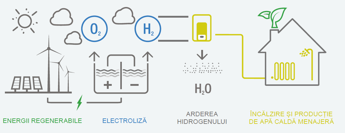 Hidrogenul este un gaz sigur si curat care, amestecat cu gazul natural pana la un raport maxim de 20-80%, permite producerea de caldura si apa calda cu emisii de CO2 mai reduse decat alti combustibili*.