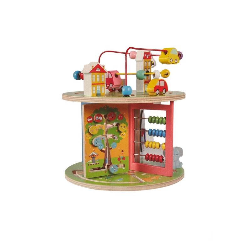 Cub din lemn sub forma de cilindru labirint cu 8 activitati: Aceasta este baza jucariei si ofera multiple activitati intr-un singur element compact. Acest cub de lemn este, probabil, elementul central al jucariei, si serveste ca punct de plecare pentru diferitele activitati.