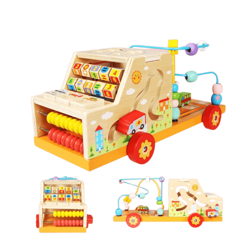 Este o jucarie multifunctiona din lemn, educativa, avand cate o activitate pe fiecare latura a sa. Activitatile centrului : Partea superioara din spate contine un labirint 3D cu margele tip Montessori, pentru dezvoltarea motricitatii fine; Pe o latura a camionului se regasteste un labirint prin care copilul va putea plimba o masinuta. Acesta imagine stimuleaza gandirea logica, gandire ce pune accentul pe intelegerea procesului din spatele fiecarei activitati; Pe partea din fata a camionului, pe „parbriz ” se afla o numaratoare cu cate 8 margele amplasate pe doua randuri si doua randuri de cifre si semne matematice pentru efectuarea de operatii matematice elementare. Tot pe partea superioara din fata, pe “capota” regasim un loc special pentru a aseza cele 3 placute cu masini ( placutele au cate doua fete). Pe a doua latura a camionului si pe „plafon” sunt 5 spatii pentru introdus cele 5 mini masinute din set. Toate aceste operatii stimuleaza gandirea logica, gandire ce pune accentul pe intelegerea procesului din spatele fiecarei activitati si ajuta la recunoasterea cifrelor, culorilor, formelor si invatarea operatiilor matematice elementare. Surpriza minunata : aceasta jucarie Montessori pentru copii este o alegere fantastica pentru orice ocazie, fie pentru fete sau baieti, ziua de nastere sau Anul Nou, Craciun sau Paste.Ii va distra si incanta pe micuti ore intregi. Ofera-i copilului oportunitatea de a-si dezvolta abilitatile esentiale in timp ce se distreaza. „Lasa copilul sa fie actorul, copilul va conduce.» -Maria Montessori Specificatii Material Produsul este confectionat din lemn, de calitate superioara si un aspect vizual placut. Vopseaua utilizata este pe baza de apa, non-toxica. Sunt realizate cu minutiozitate, astfel ca marginile sunt rotunjite si de calitate. Dimensiune camion : 33.6 cm x 14.6 cm x 9 cm Dimensiune ambalaj: 35 x 15 cm x 17 cm, 1250 grame Varsta recomandata : +3 ani (dar se poate utiliza si incepand cu varsta de 24 LUNI + sub atenta supraveghere a unui adult). Atentie! Nu lasati ambalajele jucariilor/produselor la indemana copiilor. Indepartati orice ambalaj al jucariei/produsului inainte de a da jucaria/produsul copilului. Va rugam sa supravegheati copilul in timp ce se joaca/foloseste acest produs. Pastrati instructiunile si etichetele pentru referinte viitoare. Pastrati jucaria/produsul departe de foc, feriti jucaria/produsul de temperaturi ridicate si umiditate.