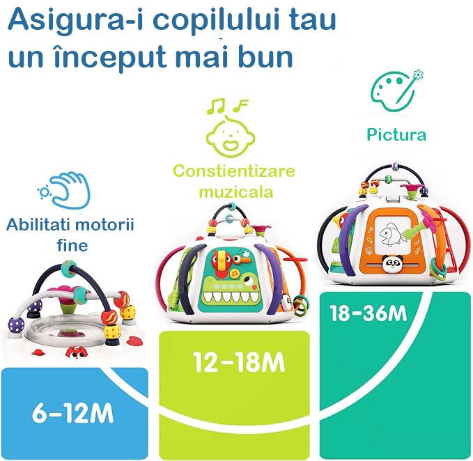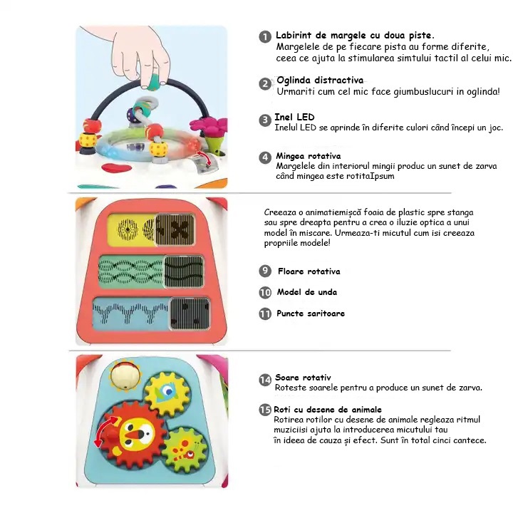 Jucarii pentru copii de inalta calitate: jucarii pentru copii de inalta calitate, realizate din material ABS non-toxic, cu margini netede si fara bavuri, asigurand un joc in siguranta pentru bebelusii peste 18 luni. Centrul nostru de activitati multifunctionale este conceput pentru a oferi oportunitati nesfarsite de recreere si invatare.