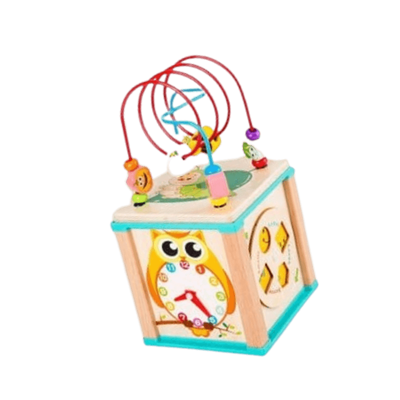 Centru din lemn educativ Montessori, Cub activitati bebelusi 5 in 1, Bufnita Centru din lemn educativ Montessori, Cub activitati bebelusi 5 in 1, Bufnita