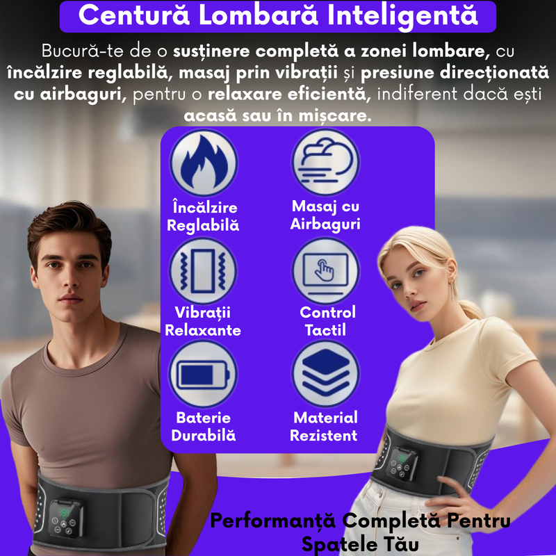 Te confrunti cu dureri de spate, oboseala sau disconfort dupa ore lungi la birou sau la volan? Aceasta centura lombara moderna este o solutie eficienta si confortabila pentru ameliorarea durerilor, relaxare musculara si reducerea stresului – oriunde te-ai afla.