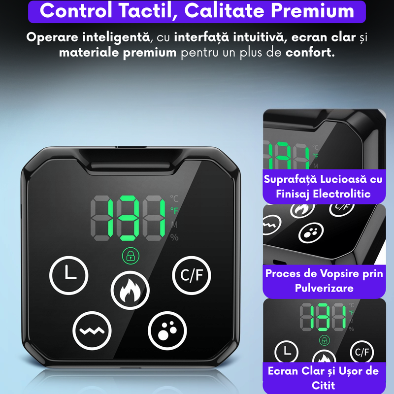 Controlul se face prin ecran tactil intuitiv, cu posibilitatea de blocare impotriva atingerilor accidentale. Include timer reglabil intre 15 si 60 de minute pentru utilizare fara griji.