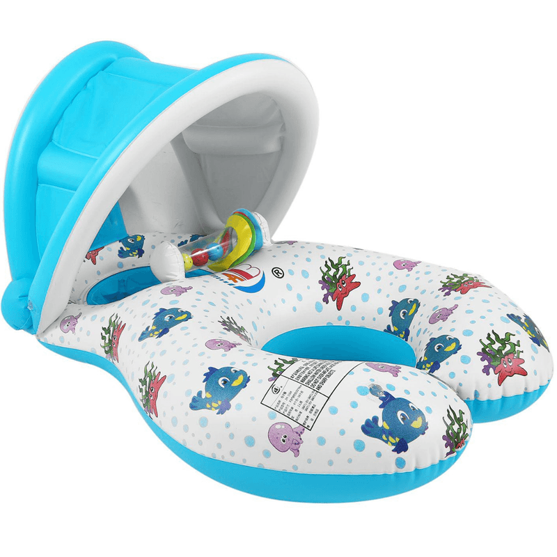 Colac inot gonflabil cu parasolar detasabil pentru bebelusi si copii, cu spatar si jucarie integrata – siguranta, confort si distractie in apa, 97x55x30cm.