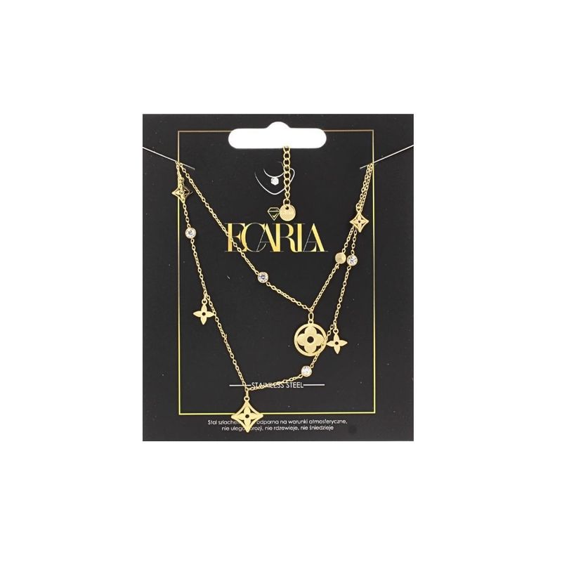 Un colier modern si stralucitor, in doua straturi, ideal pentru femeile care adora accesoriile cu personalitate. Realizat din otel inoxidabil (chirurgical) placat cu aur de 14K , acest colier combina eleganta formei geometrice cu detalii delicate: cristale translucide, elemente aurii simetrice si un joc vizual atragator.