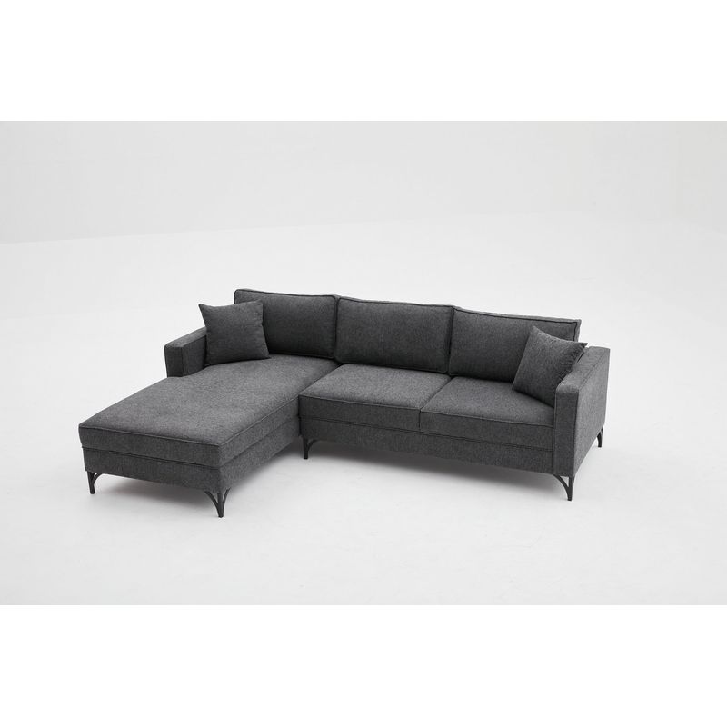 Canapeaua noastră de colț este tapițată în țesătură 100% poliester, ceea ce o face ușor de curățat și de întreținut. Spuneți adio petelor încăpățânate și bun venit curățeniei fără bătăi de cap. Picioarele metalice elegante nu numai că adaugă o notă de farmec industrial, dar oferă și stabilitate și suport.