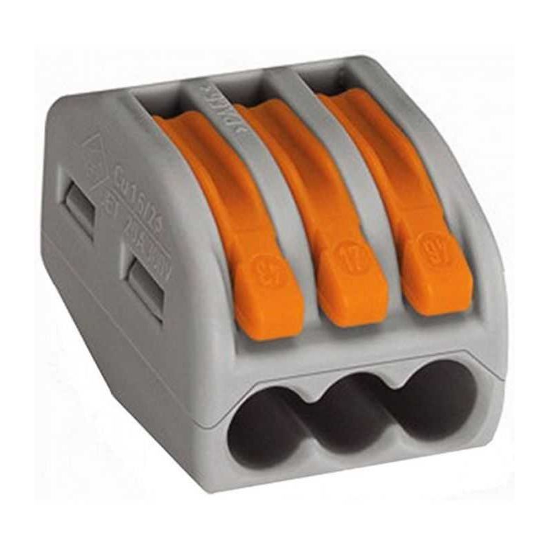 Wago 222-413 este un bloc terminal conductor compact cu 3 fire, actionat cu parghie, cu conexiune cu clema in cusca. Acest conector permite conectarea cablurilor solide, cu toroane si fin fara a fi nevoie de unelte. in timp ce minimizati spatiul din cutiile de jonctiune.