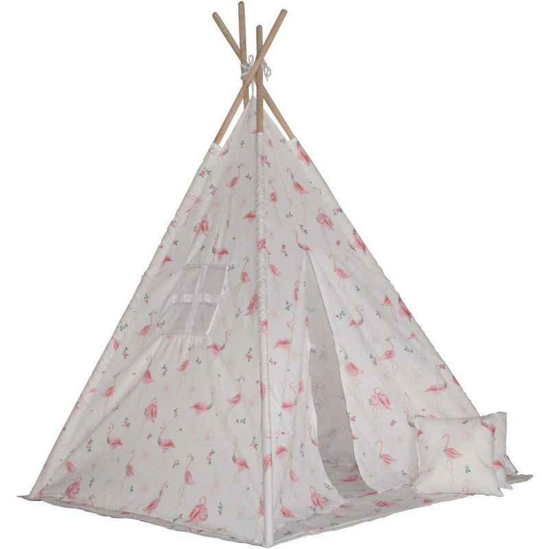 Cort de joaca Tipi, cu cadru de lemn, stil indian cu material imprimat cu pasari flamingo Cort de joaca Tipi, cu cadru de lemn, stil indian cu material imprimat cu pasari flamingo