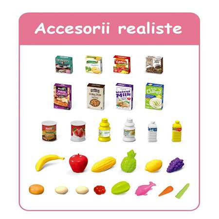 Accesoriile includ; fructe, legume si lucruri esentiale plus bani prefacuti de care micutul tau are nevoie pentru a face cumparaturi de la magazinul alimentar. Cosul de cumparaturi necesita asamblare usoara, fara unelte necesare – creand mai putin stres pentru tine si mai multa distractie pentru micutul tau