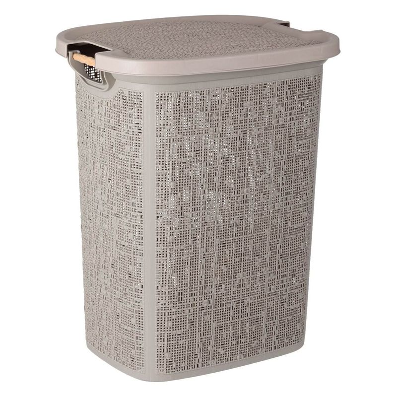 Cos de rufe, model perforat cu manere de lemn, capac detasabil, capacitate 60 l, maro cappuccino, 46 x 37 x 57.5 cm Cos de rufe, model perforat cu manere de lemn, capac detasabil, capacitate 60 l, maro cappuccino, 46 x 37 x 57.5 cm