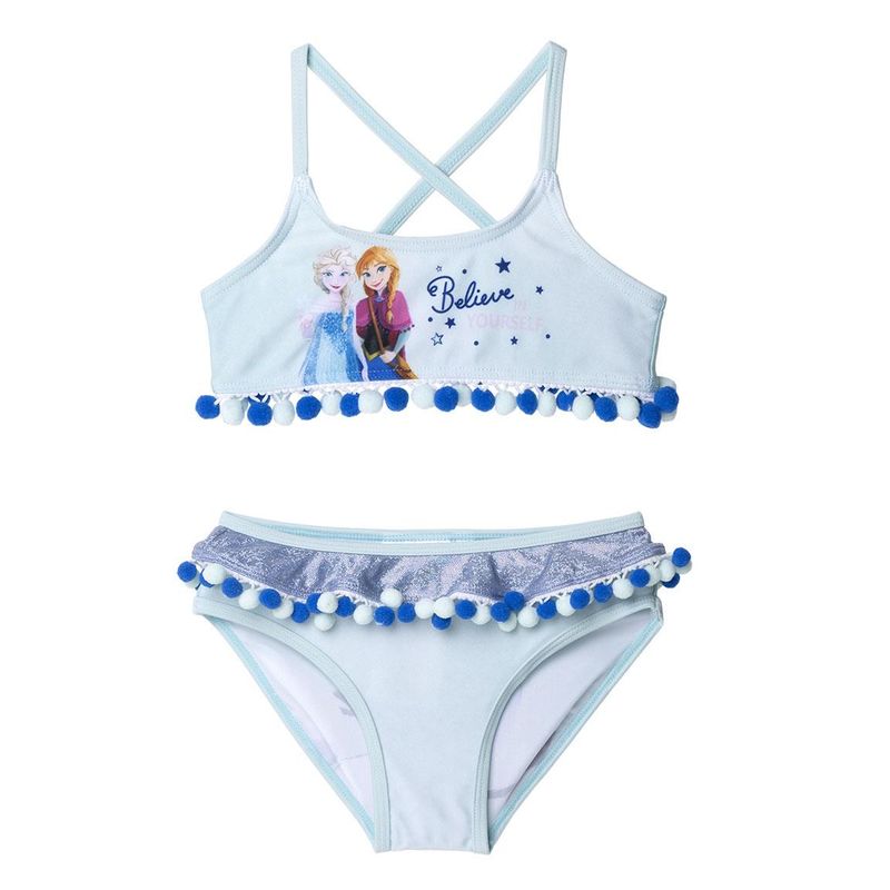 Fiecare moment petrecut in acest costum de baie in 2 piese "Frozen" cu ciucurasi este o poveste de magie si aventura. Este inspirata de legatura speciala dintre cele doua surori si spiritul prieteniei. Micuta ta va putea sa-si imagineze ca este alaturi de Elsa si Anna, explorand regatul inghetat.