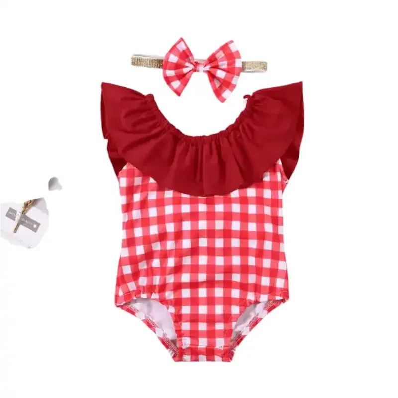 Costum de baie cu patratele rosii si bentita Costum de baie cu patratele rosii si bentita, marime 110
