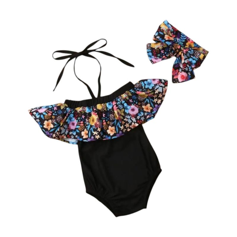 Costum de baie cu volan inflorat si bentita Costum de baie cu volan inflorat si bentita, marime 90
