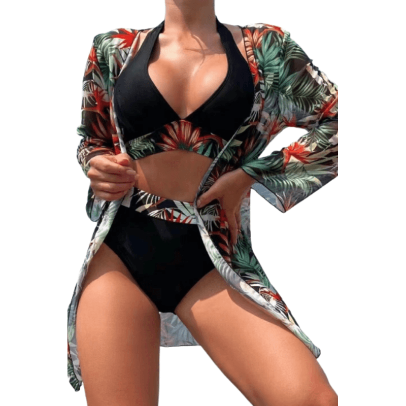 Costum de baie dama, Ava-Stars ®, Sutien tip bustiera si slip talie inalta, Camasa vaporoasa, 3 piese, L, Negru Floral Costum de baie dama, Ava-Stars ®, Sutien tip bustiera si slip talie inalta, Camasa vaporoasa, 3 piese, L, Negru Floral