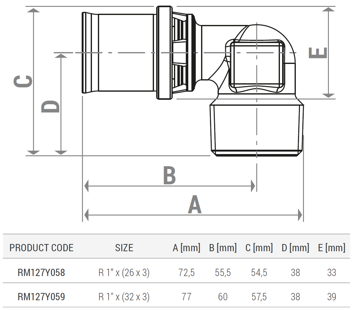 Cot de presare la 90° cu filet exterior 1" si conexiune pentru teava multistrat Ø32 mm. Modelul Giacomini RM127Y059 este realizat din alama CW617N si este conceput pentru instalatii de incalzire, racire si distributie de apa menajera, oferind o imbinare sigura si durabila intre componente.