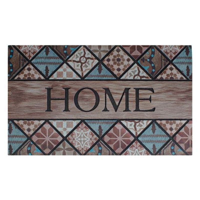 Covoras pentru intrare din cauciuc cu suprafata textila, model tiles si mesaj "HOME", 75x45 cm, bej