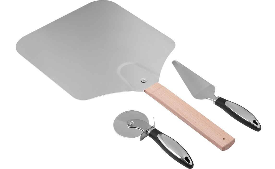 Accesorii practice incluse in pachet: spatula mica, spatula mare de scos pizza din cuptor, piatra pentru copt pizza si cutit special de taiat