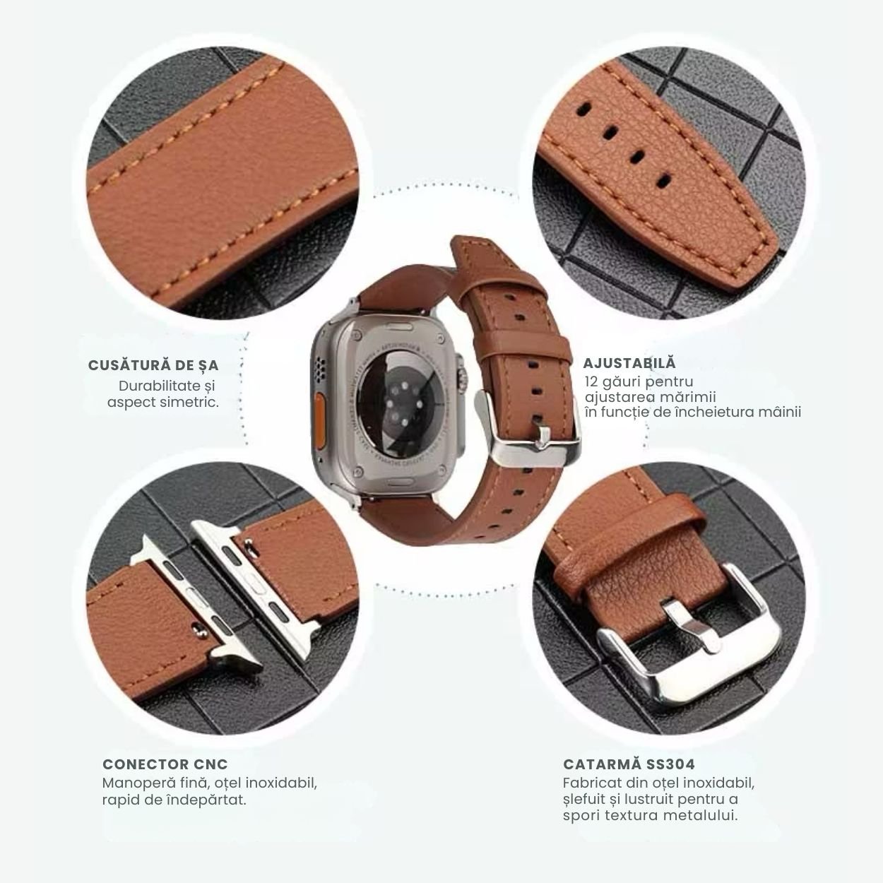 Cureaua este ajustabila, cu 12 gauri care permit o adaptare precisa pe orice incheietura, oferind confort si versatilitate. Conectorul si catarama sunt realizate din otel inoxidabil SS304, un material cunoscut pentru excelenta sa rezistenta la coroziune, uzura si oxidare. Acest tip de otel inoxidabil nu doar ca asigura durabilitatea curelei, dar si o protejeaza impotriva efectelor mediului, cum ar fi transpiratia sau expunerea la apa, mentinand catarama si conectorul intr-o stare impecabila.