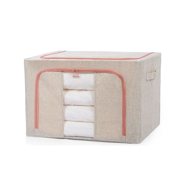 Cutie de depozitare pentru haine, pliabila, cu cadru metalic, ferestre transparente si manere, din bumbac,