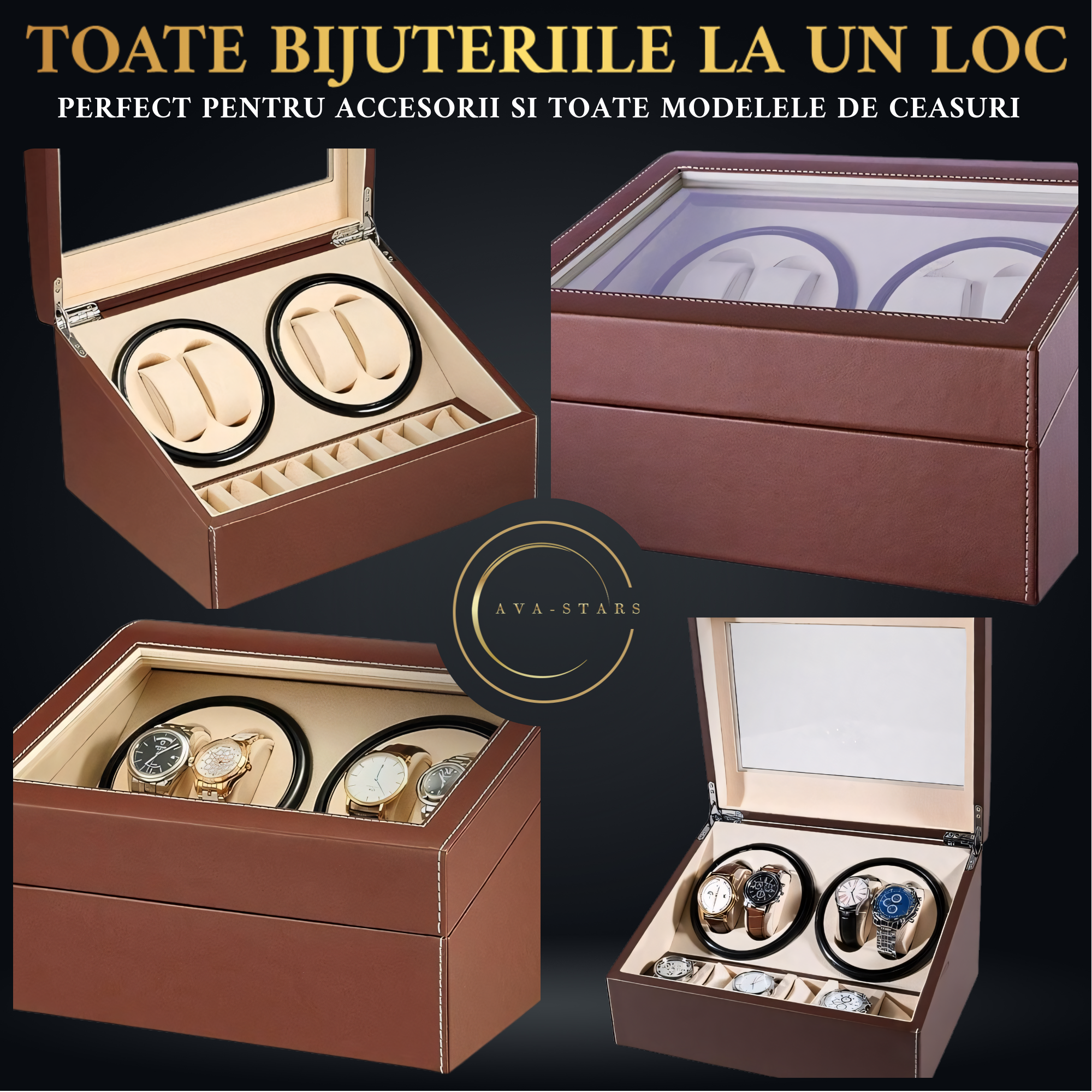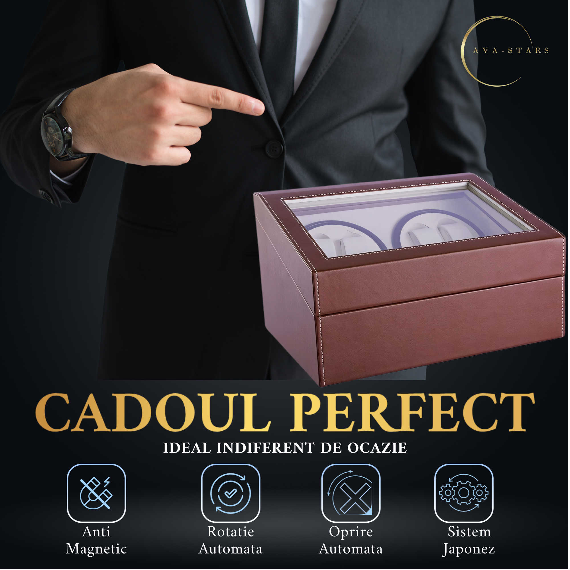 Oferiti un cadou de exceptie cu acesta cutie de intors ceasuri Ava-Stars ® . Un cadou care simbolizeaza eleganta si aprecierea pentru detalii fine, perfect pentru orice ocazie speciala, de la aniversari la reusite profesionale. Este mai mult decat un accesoriu, este o piesa de colectie ce va fi apreciata si pretuita ani de zile.