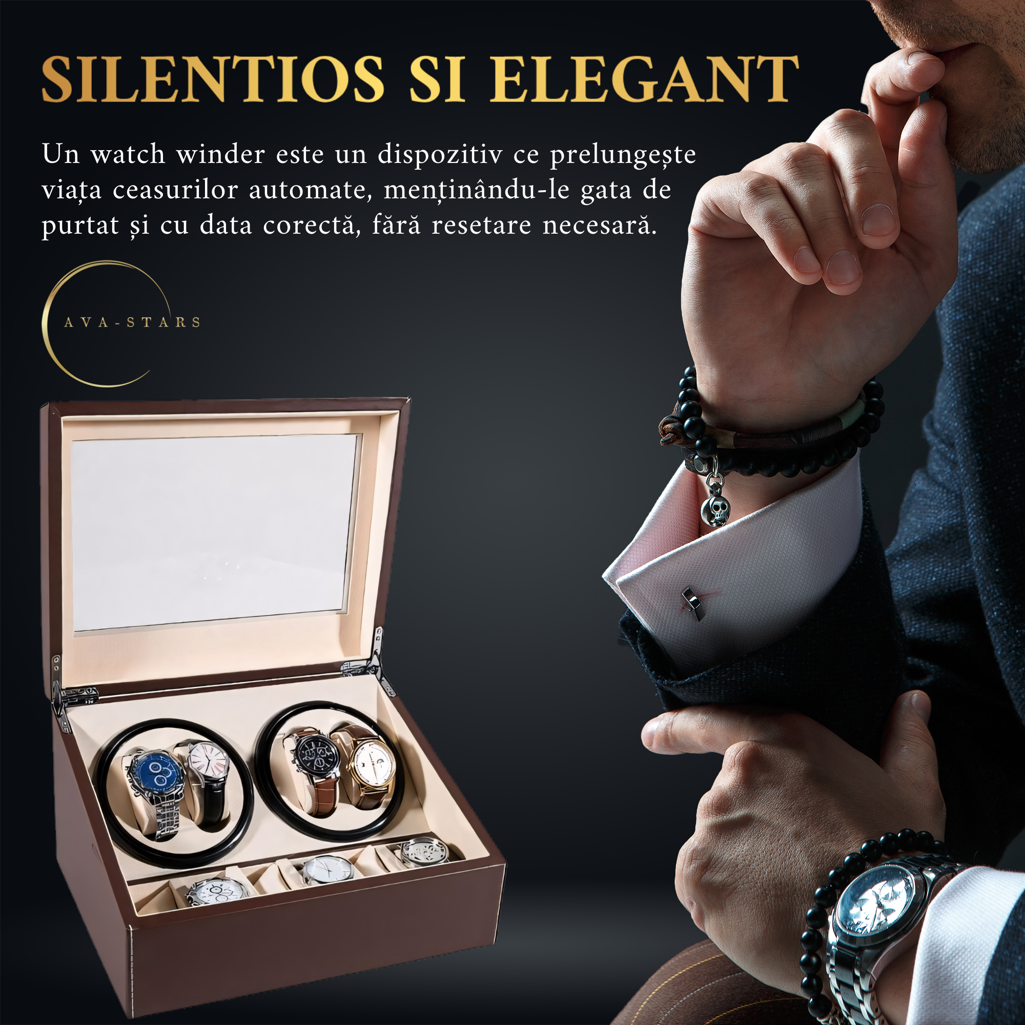 O cutie de intors ceasuri Ava-Stars ® reprezinta apogeul artizanatului rafinat. Atingand un echilibru intre inginerie de precizie si design de inalta clasa, acest dispozitiv nu este doar un simplu accesoriu, ci o piesa centrala in orice colectie de ceasuri. Materialele atent selectate, detalii atent adaugate, si tot designul creand un contrast elegant si sofisticat. Fiecare cusatura impecabila reflecta pasiunea pentru detaliu si da nastere unei cutii de o durabilitate exceptionala.