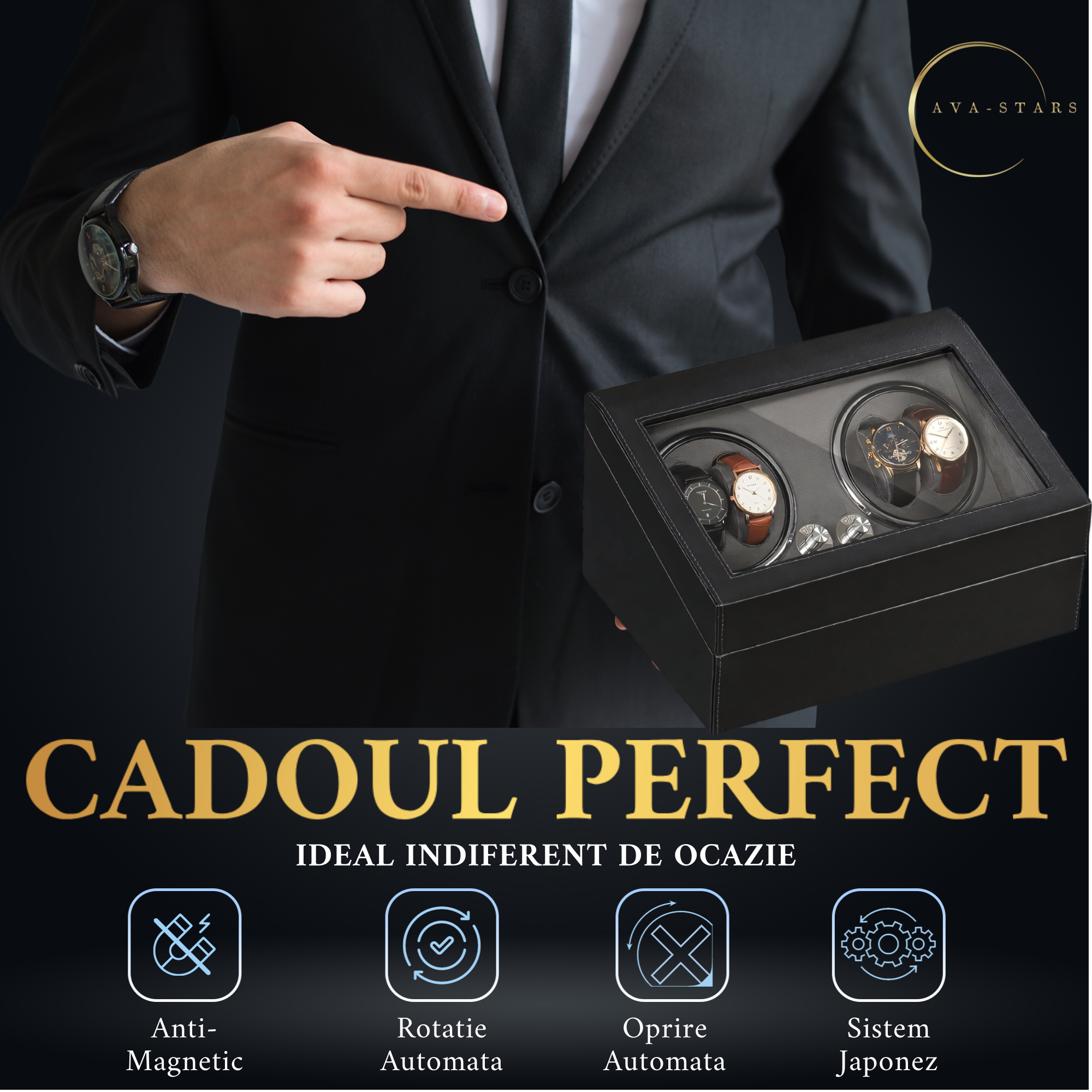 Oferiți un cadou de excepție cu acesta cutie de intors ceasuri Ava-Stars ®. Un cadou care simbolizează eleganța și aprecierea pentru detalii fine, perfect pentru orice ocazie specială, de la aniversări la reușite profesionale. Este mai mult decat un accesoriu, este o piesă de colecție ce va fi apreciata si prețuită ani de zile.