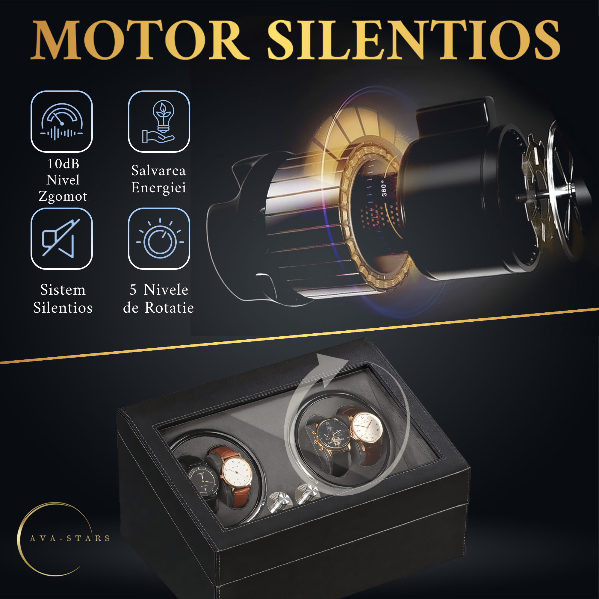 Cutia Ava-Stars ® este creată nu doar pentru a impresiona prin estetica sa de neegalat, dar și pentru a servi nevoile practice ale unui iubitor de ceasuri. Integrarea unei inchideri magnetice facilitează accesul rapid, in timp ce păstrează un profil elegant și securizat. Compatibilitatea extinsă cu o multitudine de modele de ceasuri automate face din această cutie un cadou ideal pentru entuziaștii de ceasuri de orice nivel. Fie că este vorba despre un Rolex sau un Patek Philippe, cutia de intors Ava-Stars ® este proiectată pentru a intreține și păstra cele mai prețioase piese de orologerie.