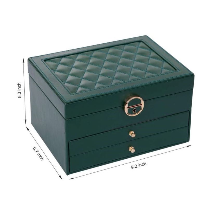 - Cutia masoara aproximativ 23 × 17 × 14 cm, ofera doua sertare si un compartiment mare in partea superioara – suficient loc pentru cercei, inele, bratari, coliere, bijuterii de valoare sau bijuterii de zi cu zi.