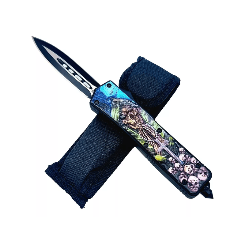 Cuțitul automat pe buton "Cap de Mort" se distinge printr-un design deosebit, cu o gravură detaliată a unui cap de mort pe mâner, care îi conferă un aspect îndrăzneț și unic.