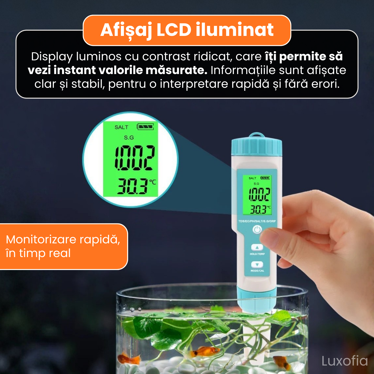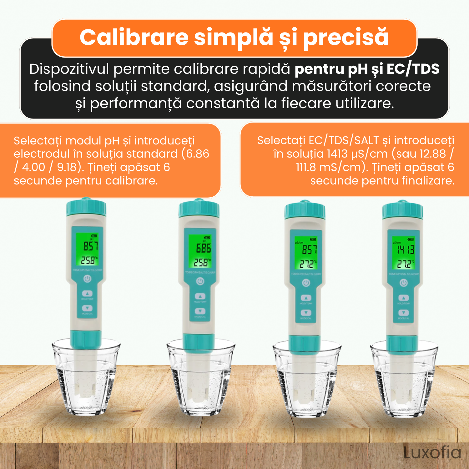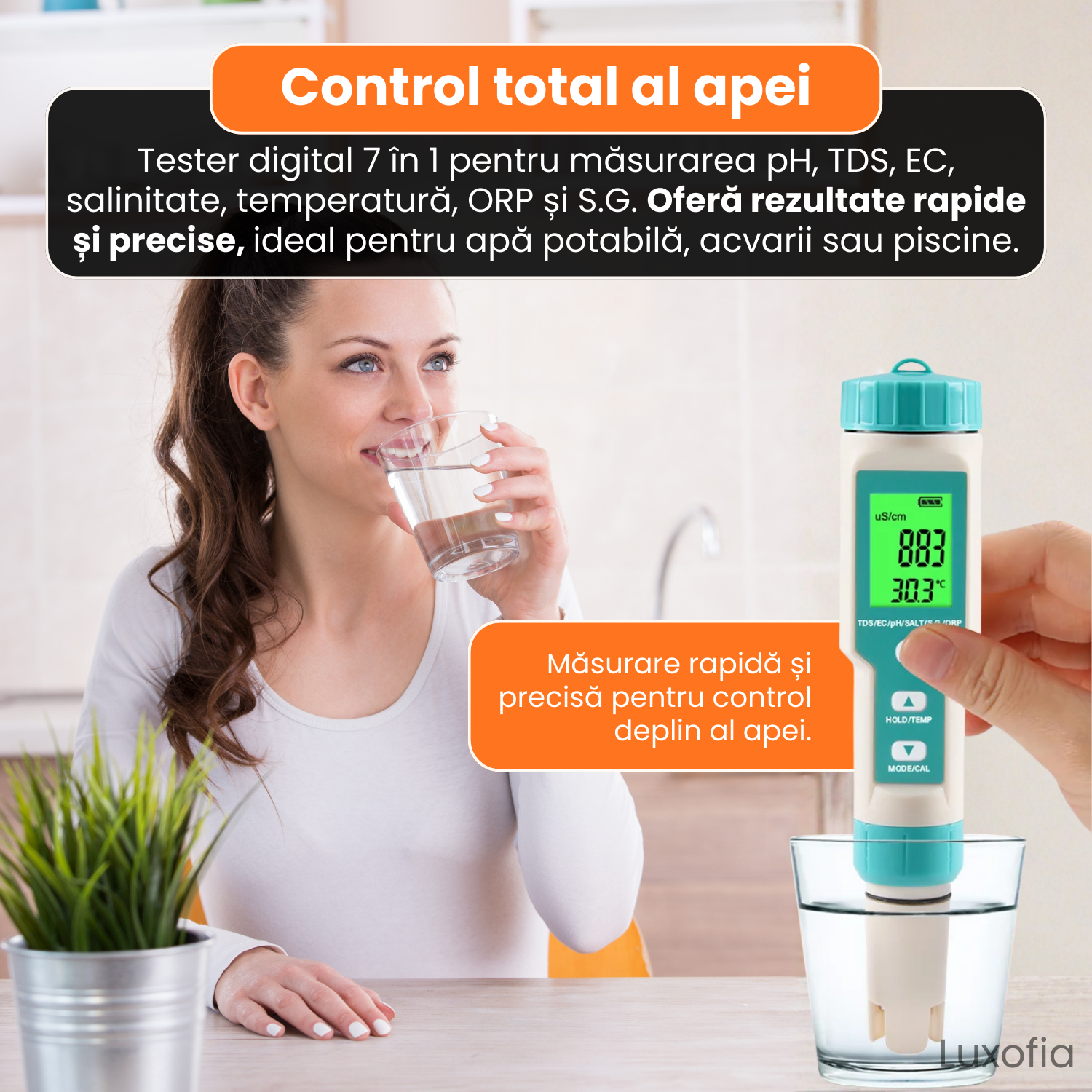 Functii: pH, TDS, EC, ORP, Salinitate,