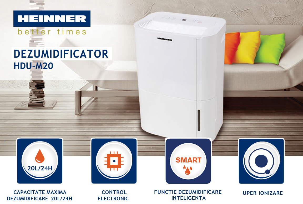 Cu o capacitate maxima de dezumidificare de 20l/24H si rezervor de 3L, HEINNER HDU-M20 te ajuta sa pastrezi o umiditate optima in casa si este recomandat pentru incaperile cu arie cuprinsa intre 37 si 52 mp.