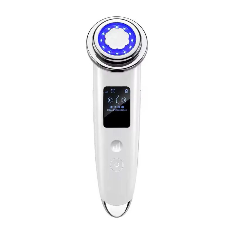 Este un dispozitiv de infrumusețare facială cu microcurent EMS VIDEO EMS FACIAL(ioni galvanici), masaj cald cu vibrații, lumină roșie, albastră și verde care poate efectua curățare profundă, intinerire mai bună și lifting facial.