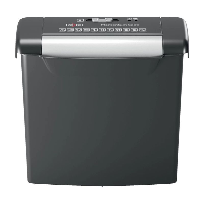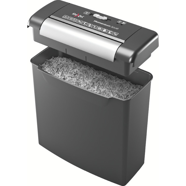 Distrugatorul pentru documente Rexel Momentum S206 are  nivel de securitate P2, Strip Cut (taiere tip fasii), distruge pana la 6 coli de hartie o data, timpul de functionare continuu este de 2 minute, ideal pentru utilizarea acasa.