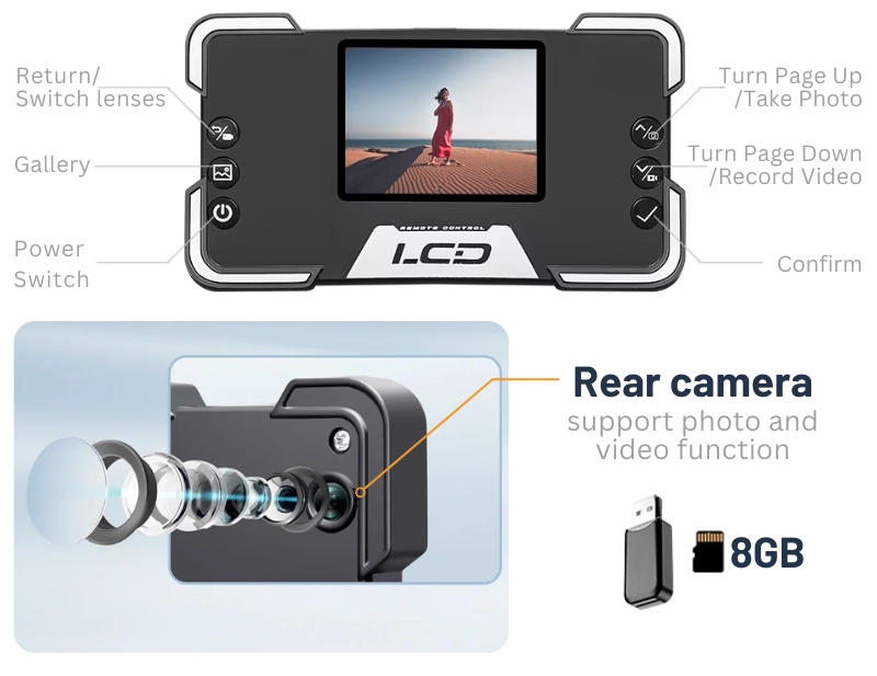 O caracteristica distinctiva este telecomanda cu ecran separat, care nu doar afiseaza fluxul video, dar include si propria camera pe spate si un card de memorie de 8GB, putand servi ca dispozitiv foto-video independent.