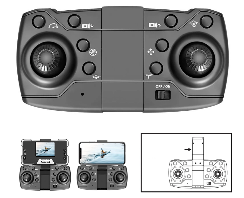 Drona iUni M10 vine cu o telecomanda care are incorporat un suport pliabil pentru ecranul LCD(inclus in pachet) sau smartphone pentru o operare foarte usoara.