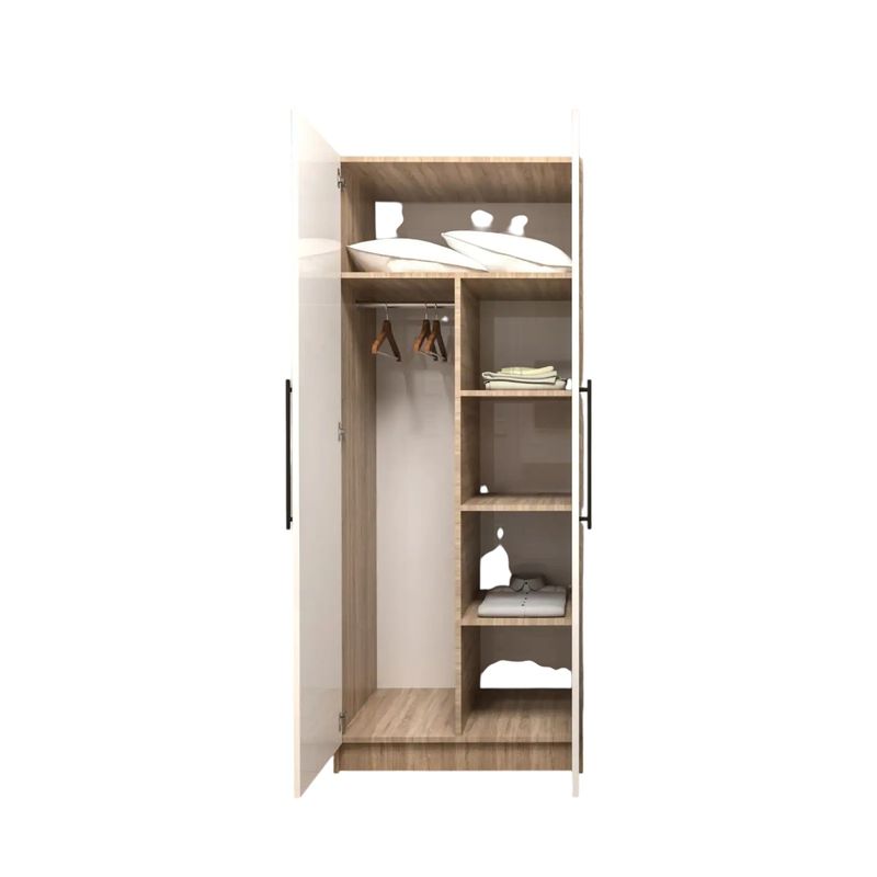 Dotat cu doua usi, dulapul include o compartimentare inteligenta, formata din cinci polite spatioase si o bara pentru umerase. Politele sunt perfecte pentru organizarea hainelor pliate, a lenjeriei sau a altor obiecte esentiale, in timp ce bara pentru umerase asigura o depozitare practica pentru hainele ce necesita o asezare fara cute.