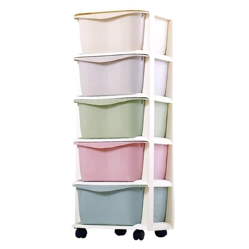 Cu un design îngust si înalt, dulapul utilizeaza inteligent spatiul pe verticala, fiind perfect pentru încaperi mici sau zone greu de valorificat. Cele 5 sertare încapatoare, în culori pastelate placute, permit sortarea usoara a diferitelor obiecte, pastrând totul la vedere si bine organizat.