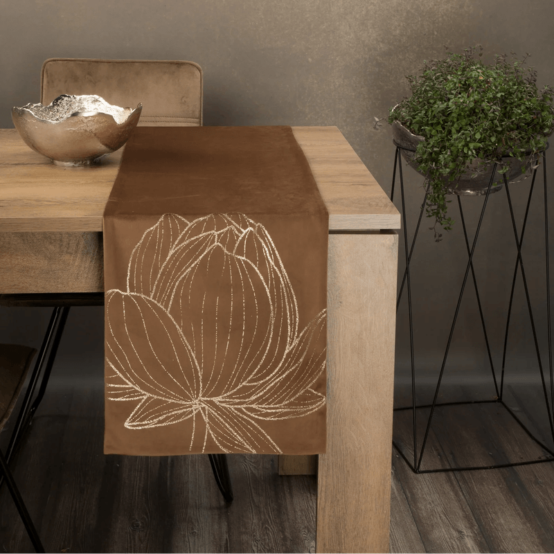 Fata de masa BLINK 12 din catifea cu model floral botanic tip flori de lotus, 35 x 140 cm Fata de masa BLINK 12 din catifea cu model floral botanic tip flori de lotus, 35 x 140 cm, maro