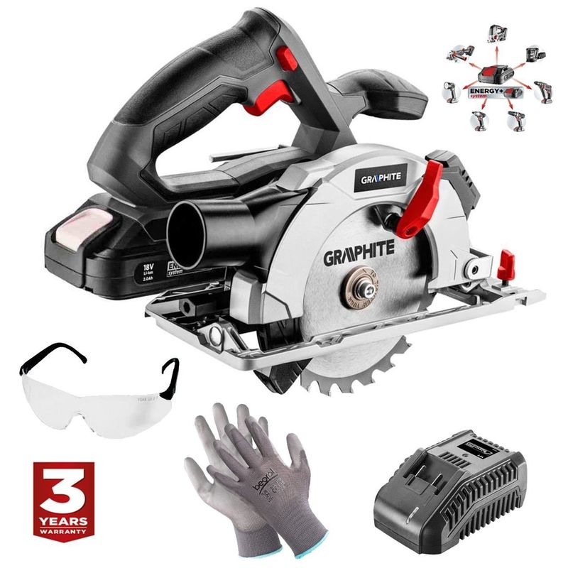 Fierastrau circular de mana, cu acumulator 2 Ah, incarcator 18 V Li-ion, cu ochelari, manusi, 150x10 mm, Graphite Energy Fierastrau circular de mana, cu acumulator 2 Ah, incarcator 18 V Li-ion, cu ochelari, manusi, 150x10 mm, Graphite Energy