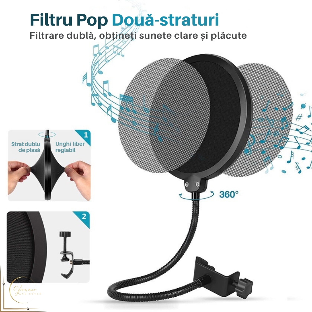 TV, Audio-Video si FotoAudio Hi-FiAccesorii Audio Hi-FiFiltru protectie microfon Profesional, Filtrare Dubla, Flexibil 360°, Gat de metal Reglabil, Negru+Gri, Pop Filtru