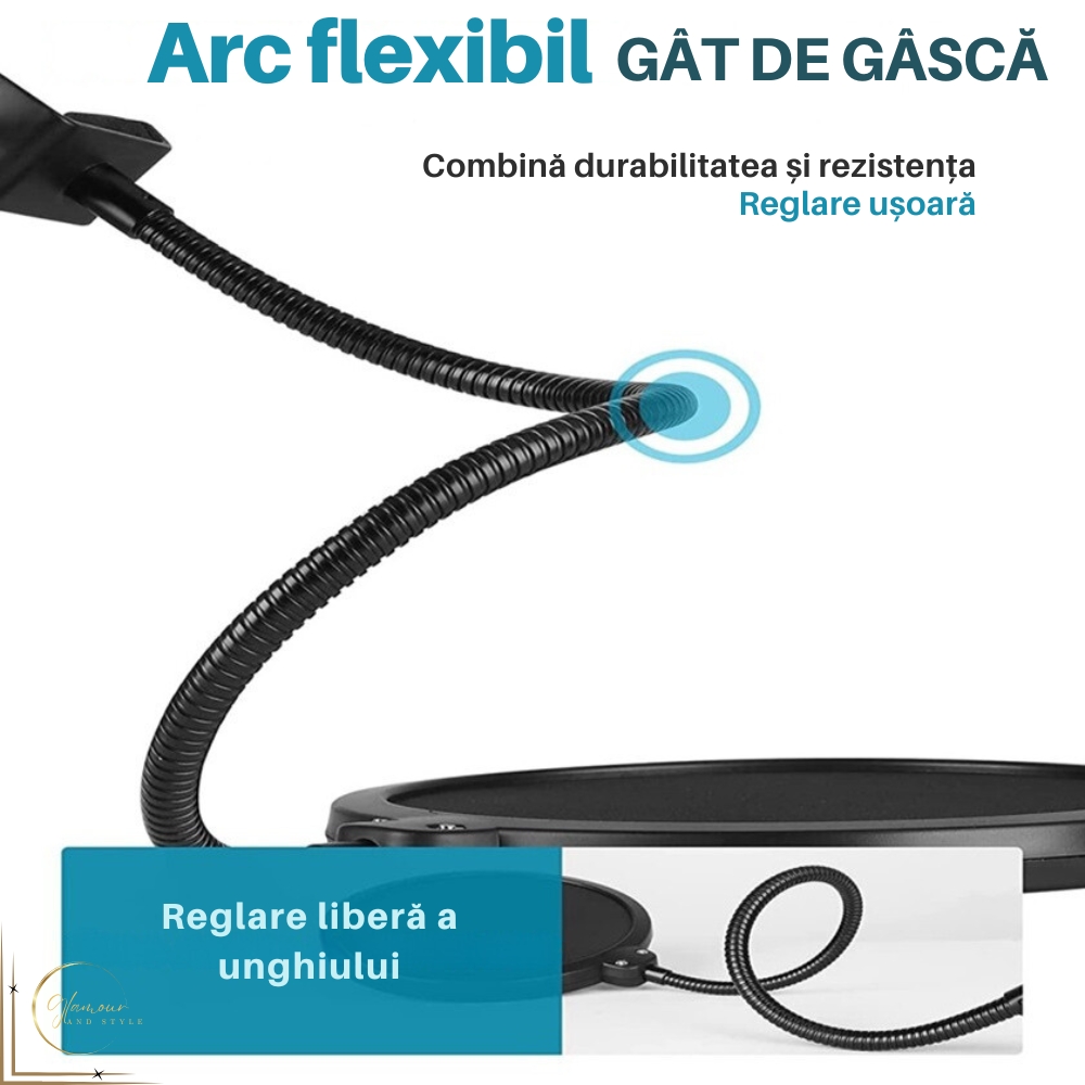 • Suport Flexibil: Dotat cu un suport tip gooseneck flexibil si robust, ce permite ajustarea la 360 de grade. Materialul din otel neted si indoibil confera durabilitate si stabilitate, sustinand ferm greutatea filtrului.