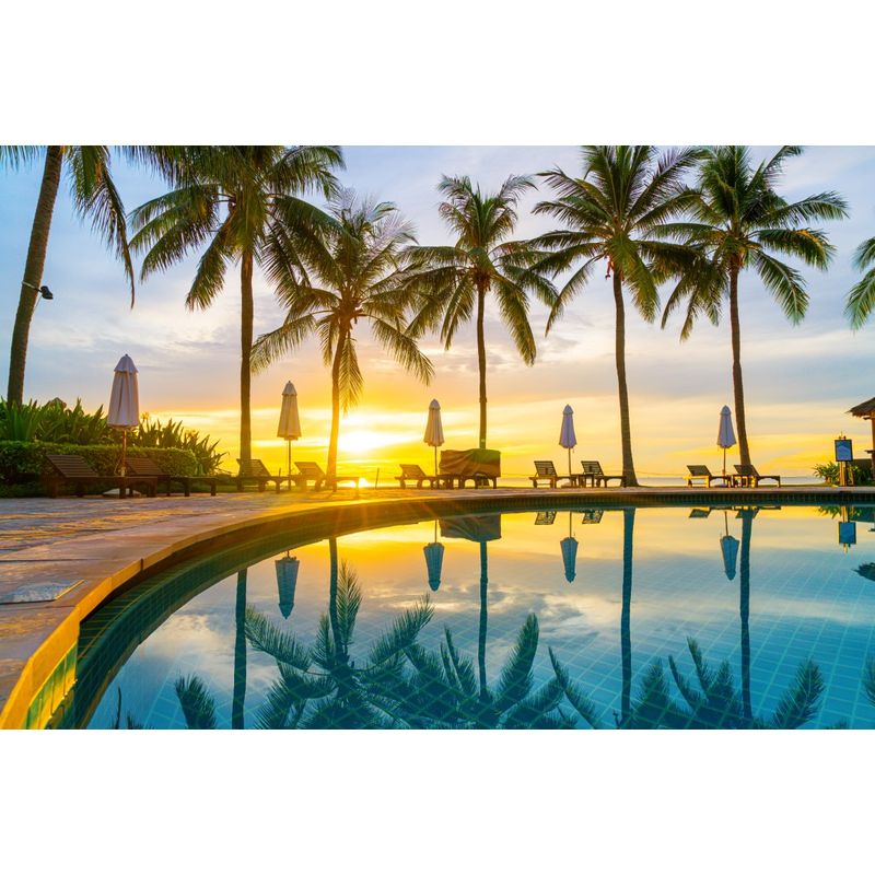 Fototapet de perete, autoadeziv si lavabil, Plaja 79 cu piscina si palmieri Fototapet de perete, autoadeziv si lavabil, Plaja 79 cu piscina si palmieri, 200 x 150 cm