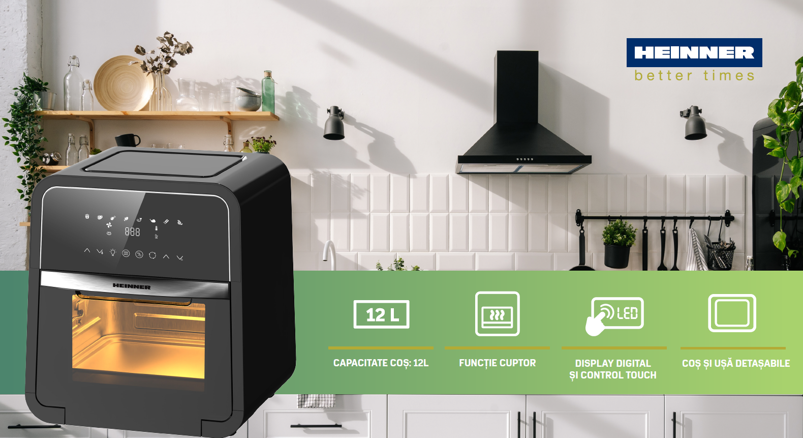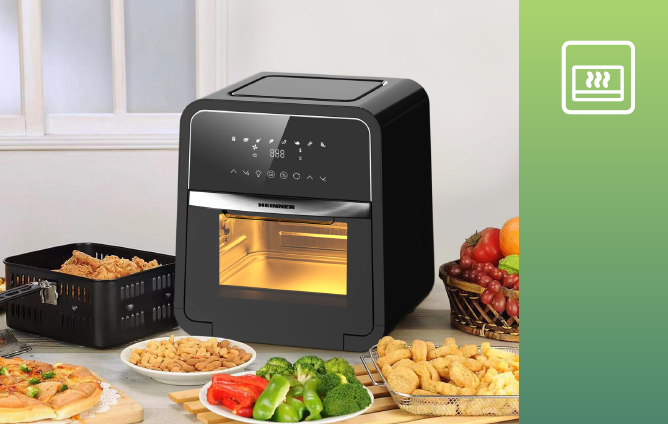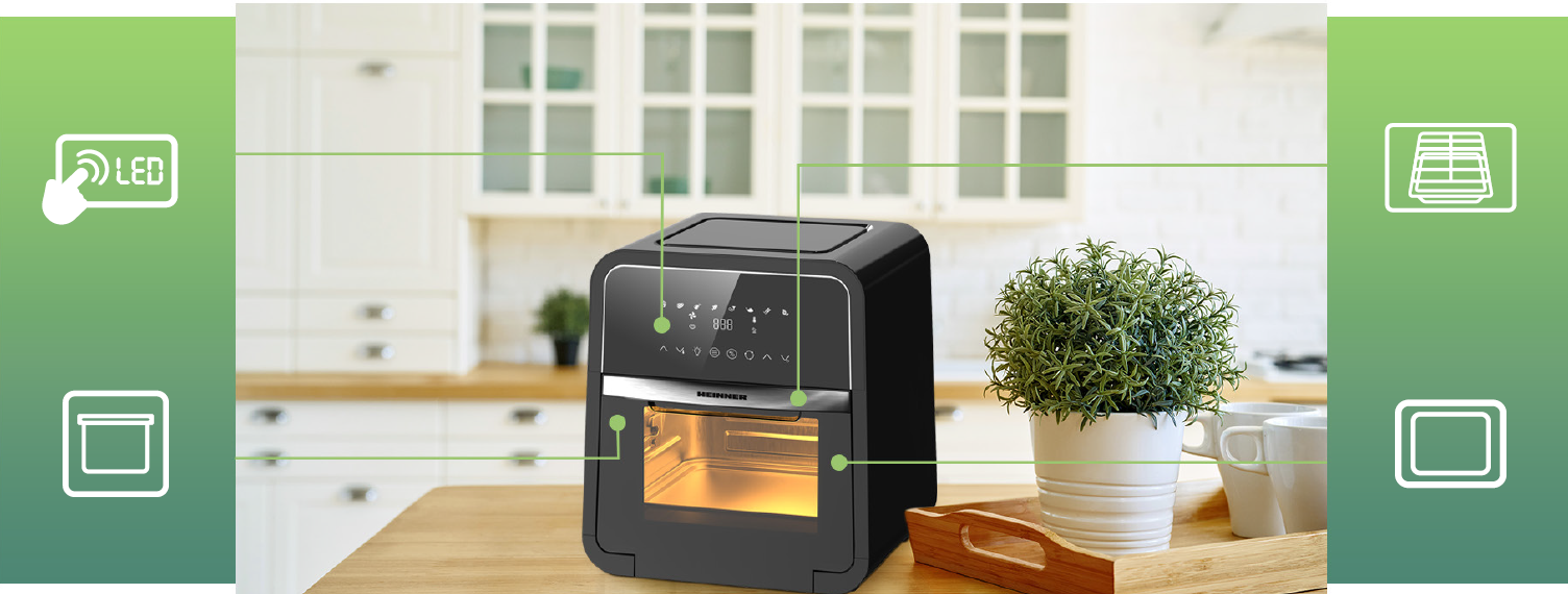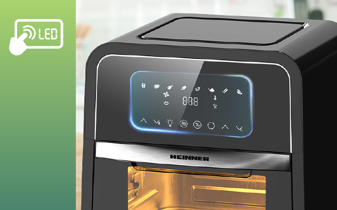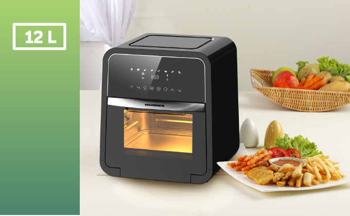 Friteuza cu aer cald Heinner Masterfry HAF-B12BK2000, 2000w, functie cuptor, capacitate: 12l, display digital cu control touch, timer 60 min, deshidratare 24h, temperatura 30-200 grade, 8 programe presetate, 3 nivele de gatire, oprire automata, negru