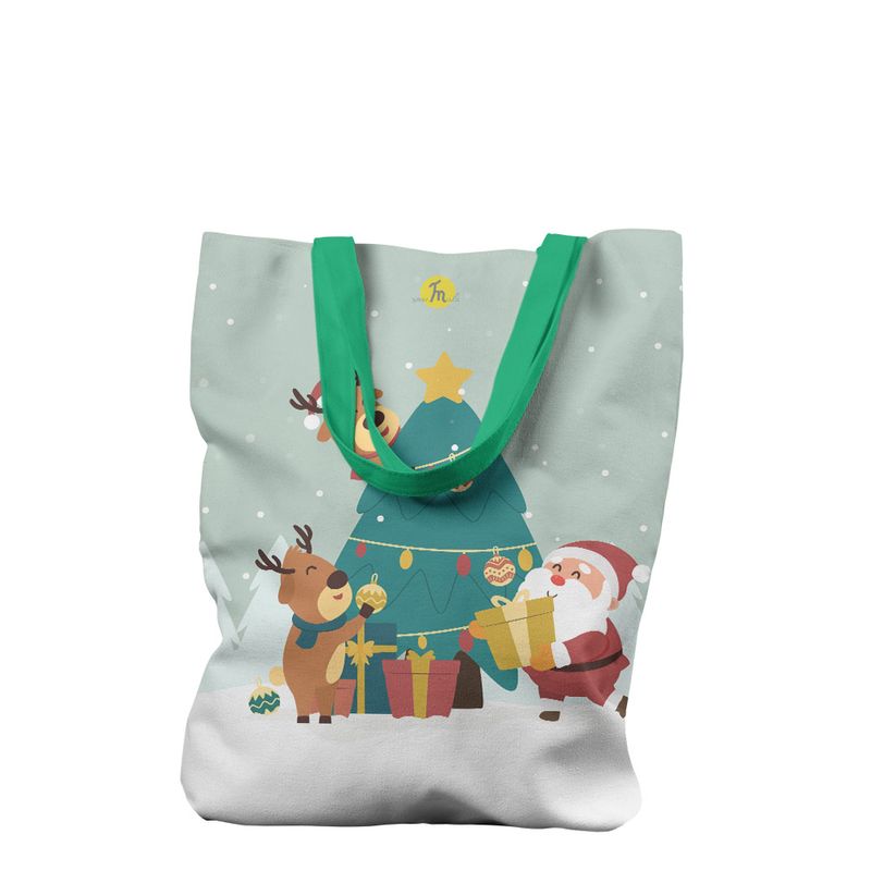 Geanta Handmade Tote Liner cu Captuseala, Renii si Mos Craciun Impodobesc Bradul, Multicolor, 43x37 cm Geanta Handmade Tote Liner cu Captuseala, Renii si Mos Craciun Impodobesc Bradul, Multicolor, 43x37 cm
